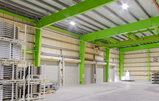 高さ5.0m 横幅8.0mの大型スピード電動シャッターを2ヶ所配置。